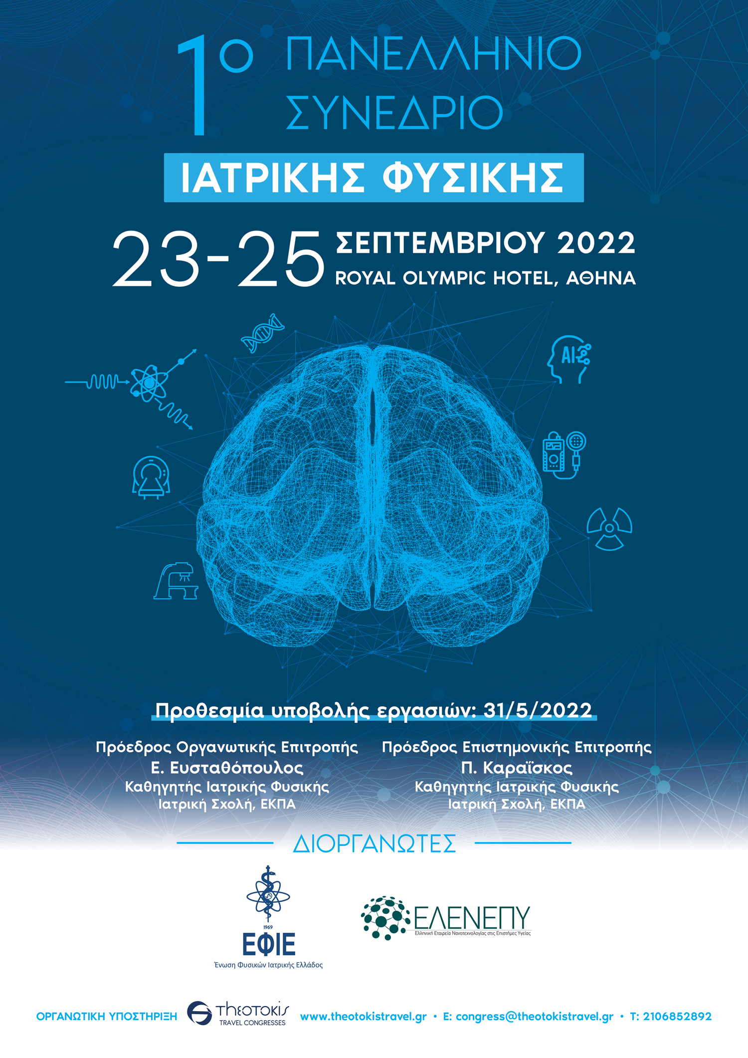 Η Ένωση Φυσικών Ιατρικής Ελλάδος (ΕΦΙΕ) και η Ελληνική Εταιρεία Νανοτεχνολογίας στις Επιστήμες Υγείας (ΕΛΕΝΕΠΥ) συνδιοργανώνουν το 1ο Πανελλήνιο Συνέδριο Ιατρικής Φυσικής, στις 23-25 Σεπτεμβρίου 2022 στην Αθήνα, στο Royal Olympic Hotel.